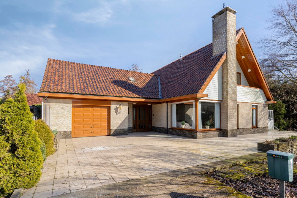 Stevige traditionele bouw op betonnen palen, massieve metselwerkgevels, hardhouten kozijnen met dubbelglas, zadeldak met pannen. Inclusief inpandige garage plus 2 garages.